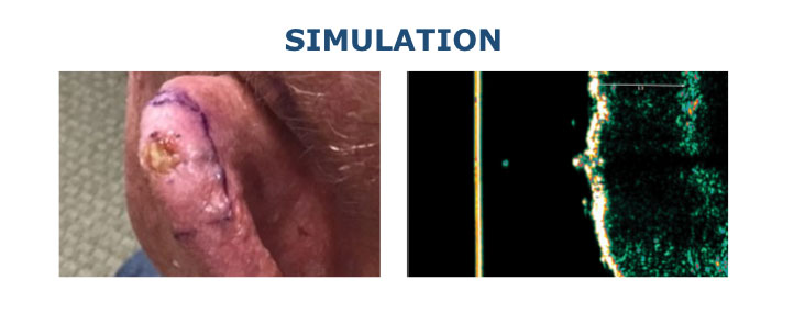 Patient with basal cell skin cancer on the top of the ear before treatment with GentleCure (Image-Guided SRT). You can see the cancer on the skin. The ultrasound image clearly defines the skin cancer under the skin, indicating the full depth, width, and breadth of the cancer.