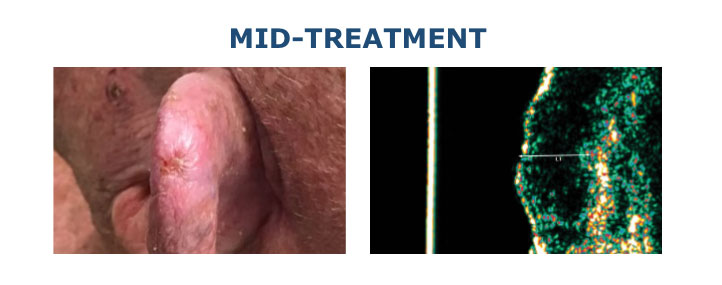 About half way through treatment with GentleCure (Image-Guided SRT), you can see the cancer reducing in size on the outside of the skin. The ultrasound image shows that the cancer under the skin has also been reduced.