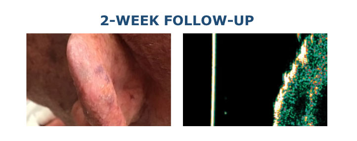 At the two-week follow-up visit after treatment was completed, the outside of the ear shows no signs of cancer. The ultrasound image shows that GentleCure (Image-Guided SRT) continued to eliminate the cancer. At the 30-week follow-up appointment, the ultrasound image showed no signs of cancer.